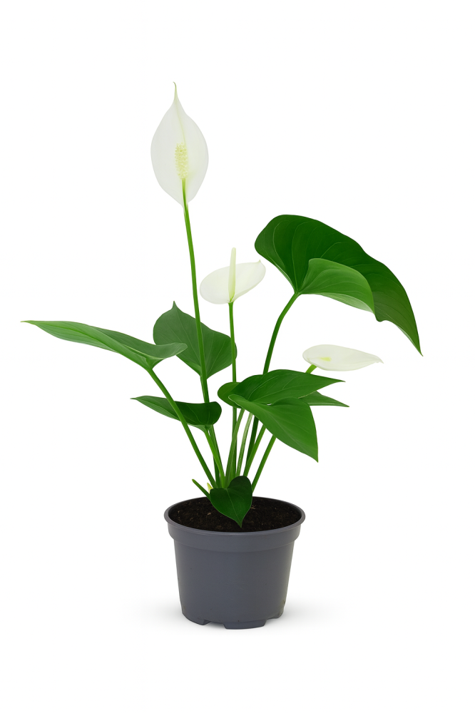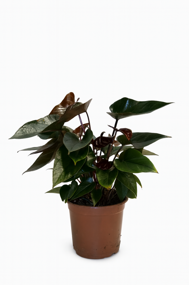 - نبات الأنثوريوم (Anthurium) يتميز بأوراقه الخضراء اللامعة وأزهاره القلبية الشكل ذات الألوان الزاهية مثل الأحمر والأبيض والزهري.